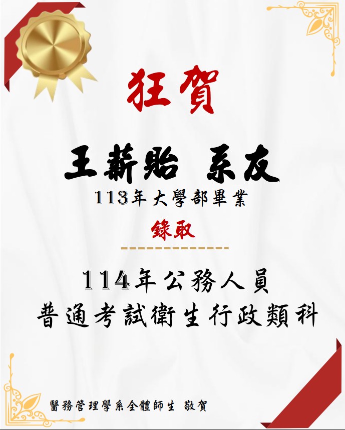 恭賀!本系王薪貽系友通過公務人員衛生行政普考