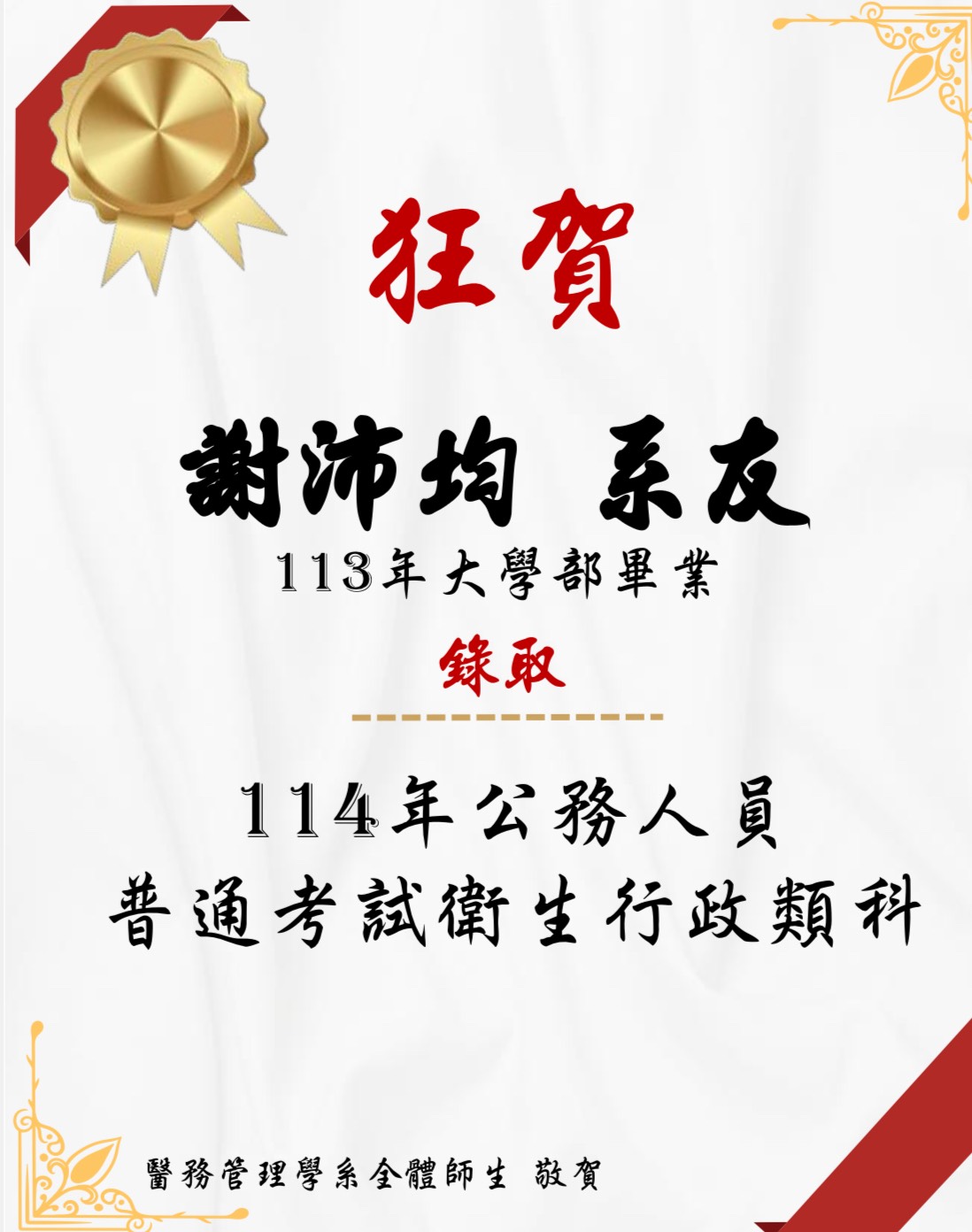 恭賀!本系謝沛均系友通過公務人員衛生行政普考