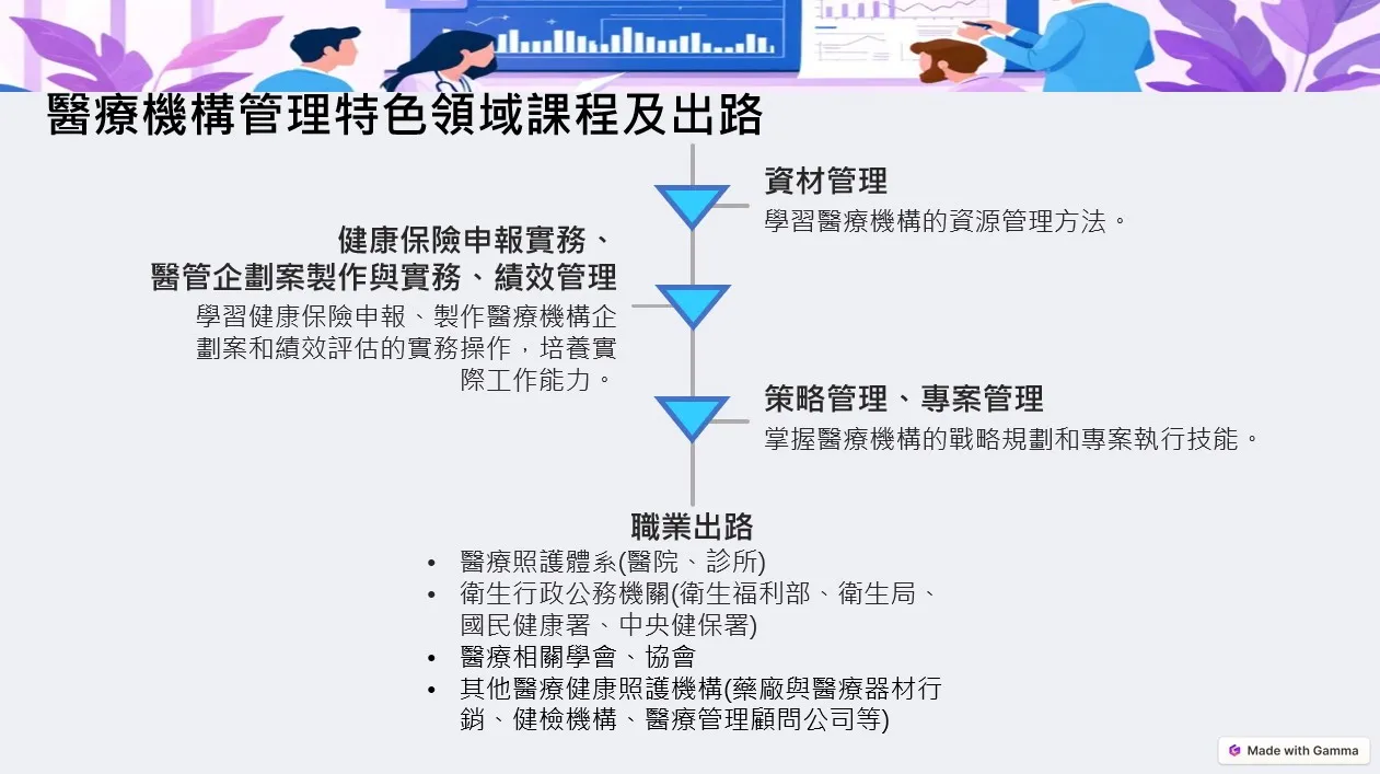 醫療體系(醫療院所、長照機構)行政管理職務;衛生行政公務機關(衛福部、衛生局、中央健保署)行政管理職務;醫療相關基金會、協會幹事;醫療機構、醫療顧問公司研究分析人員;其他醫療健康照護機構(健檢機構、藥廠與醫療器材行銷人員、醫療管理顧問公司等)行銷、行政、教育訓練人員。