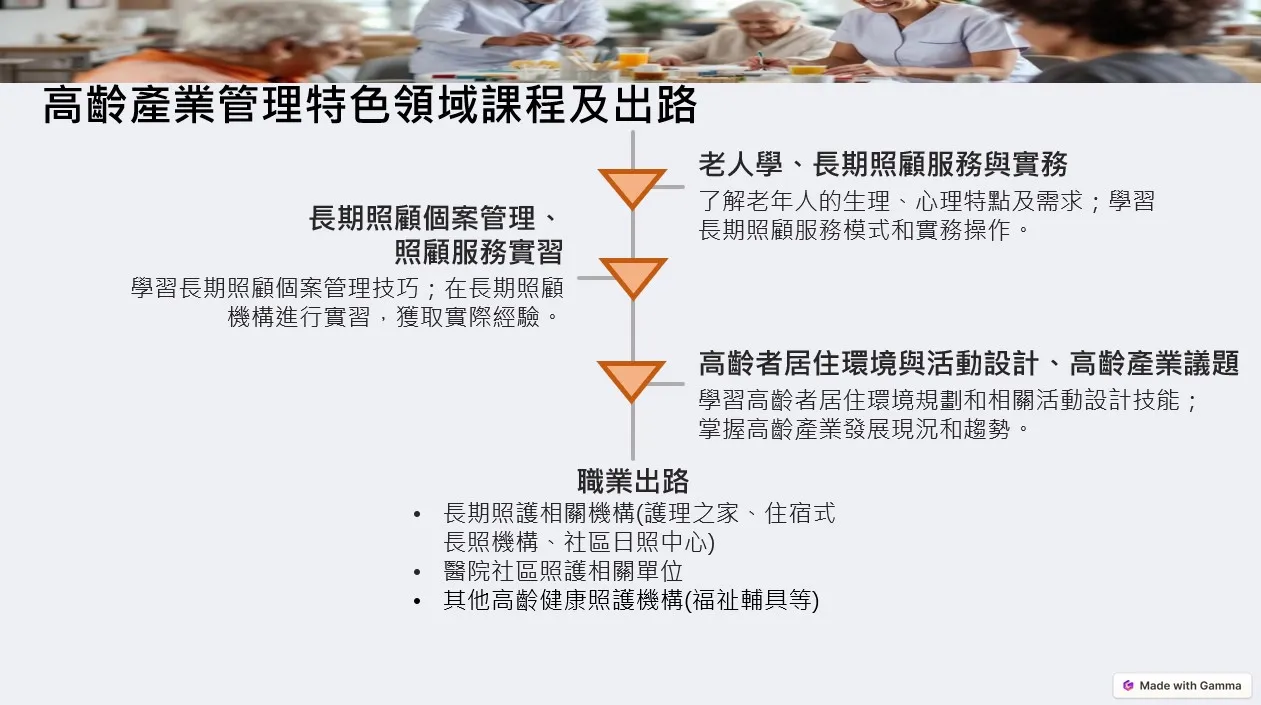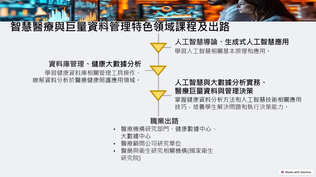醫管、公衛、人力資源管理等相關科系之研究所(另本系設有碩士班,推廣五年一貫大學直升碩班)。